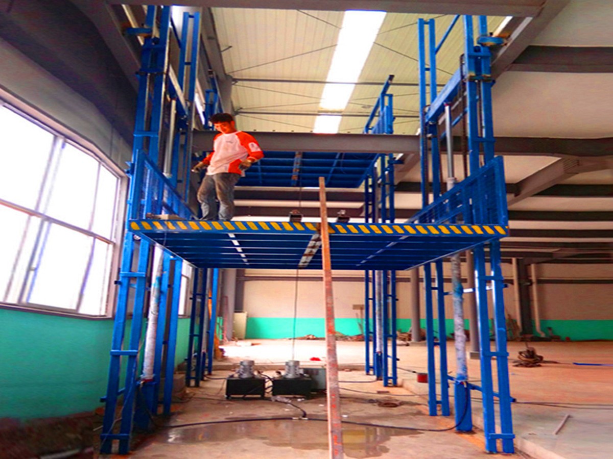 1、導軌式升降平臺大承載20噸,實現(xiàn)多點控制,上下樓層互動聯(lián)鎖,達到使用。