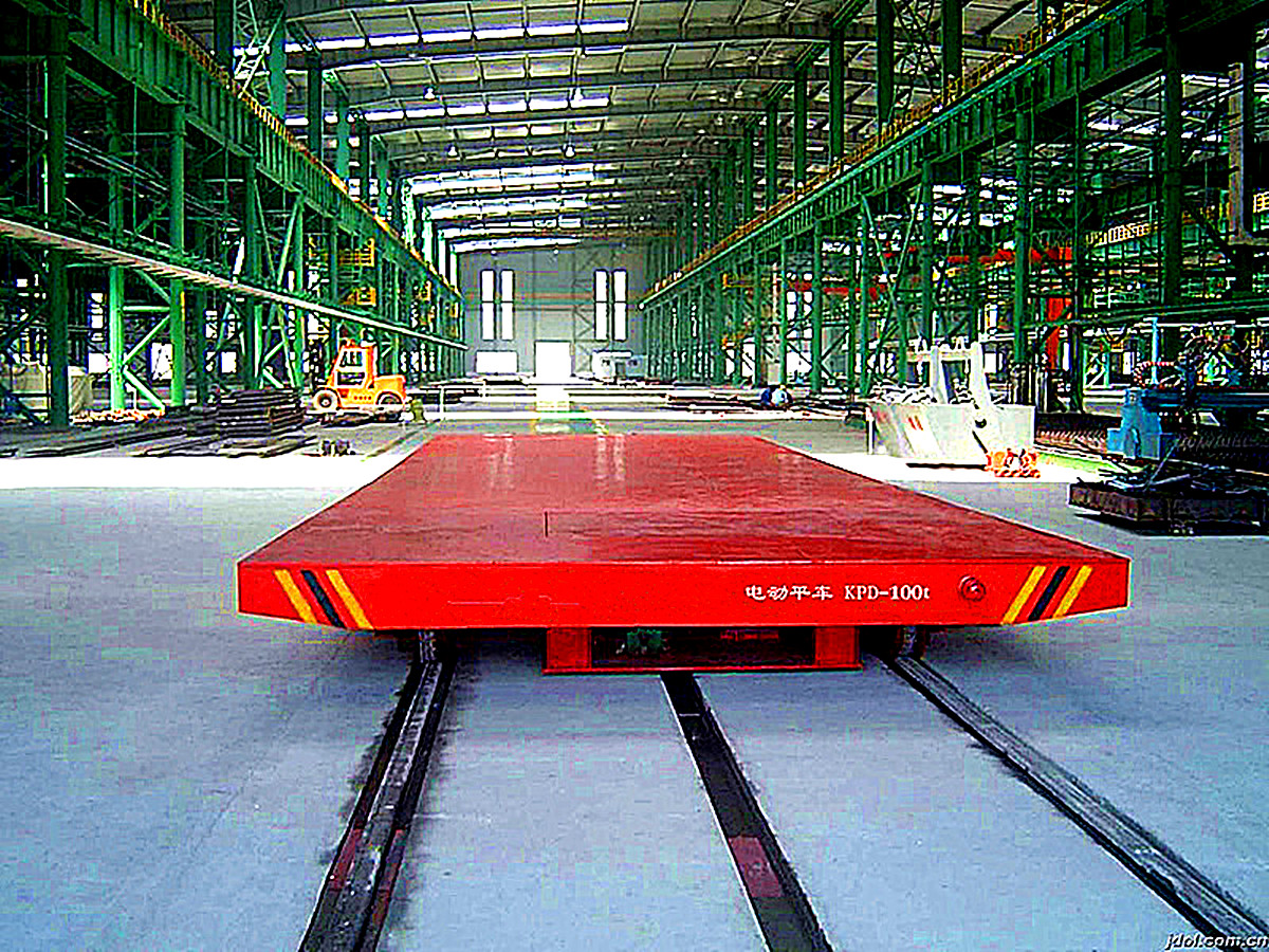 電動平車,又稱電動平板車、電平車、臺車、過跨車、地爬車等,是一種廠內有軌電動運輸車輛,首先它是一種軌道型運輸車輛,需要在地面上鋪設軌道,軌道一般為工字型面接觸道軌;其次它是電驅動車輛,在電機減速機驅動下自動運行,再次它是一種平板車,臺面平整無廂蓋,特殊情況下也可以是非平面但無廂蓋,車體無方向盤只有前進后退方向(即使轉彎也城靠軌道轉彎)。此種車輛具有結構簡單、使用方便、承載能力大、不怕臟不怕砸、維護容易、使用壽命長等特點,因其方便、壯實、經濟、實用、易清理等,成為企業(yè)廠房內部及廠房與廠房之間短距離定點頻繁運載重物的運輸工具。